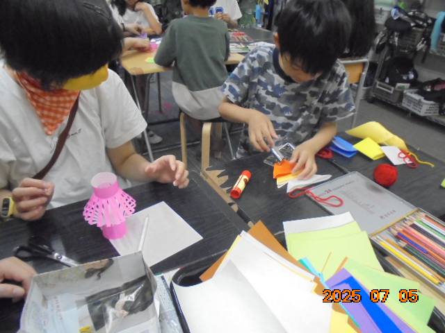 ハサミやのりを上手に使い、貝がら・スイカ・天の川・提灯・星などの飾りを作りました。