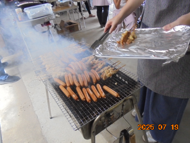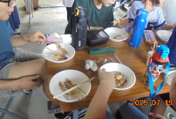 夏休みが始まり、子どもたちはワクワクしながらBBQを楽しみました。焼き鳥、ウインナー、コーンを食べました。