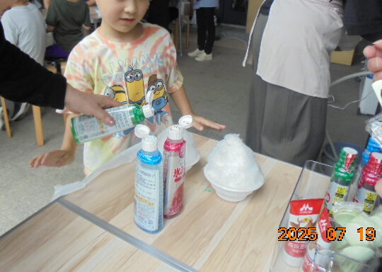 くじ引きを引いてかわいい形の消しゴムをもらいました。冷たいかき氷にたっぷり氷みつをかけてもらいおいしく食べました。