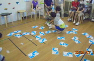 1チーム10人の班でゲームをしました。風船ラリーでは全員が手をつないだまま、協力して風船を床に落とさないようにしました。