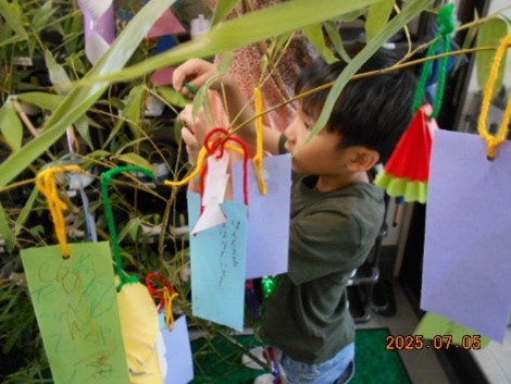 もうすぐ七夕。短冊にお願いごとを描き、いろんな形の笹飾りを作って飾りつけをしました。