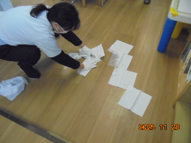 嘔吐物を処理する職員、児童を介助する職員、他の児童を移動させ対応する職員に分かれ行いました。