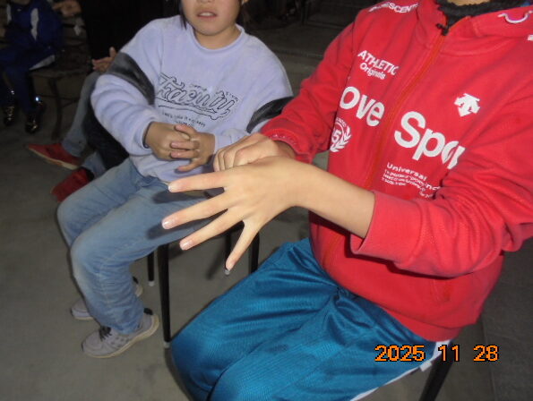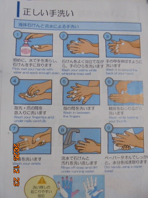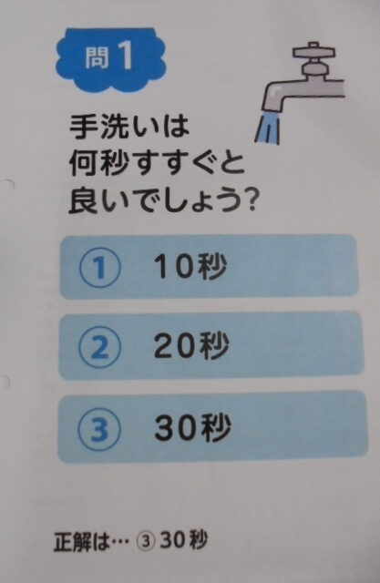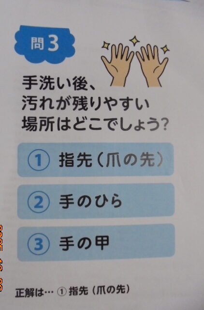 普段からの手洗い、消毒についても正しい方法を学び、手の汚れが残りやすい場所や、水ですすぐ時間など考えました。