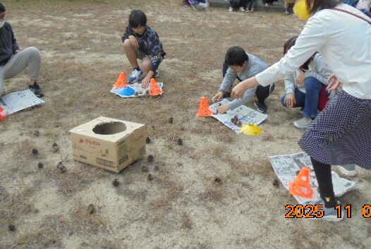 松ぼっくり玉入れでは、穴の開いた段ボールに松ぼっくりを投げ入れました。