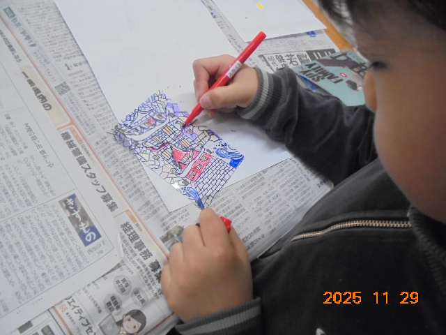 子ども達は描きたい絵を描いたり、見本の絵を使ったりし、それぞれが発想を生かしたオリジナルの作品が出来上がりました。