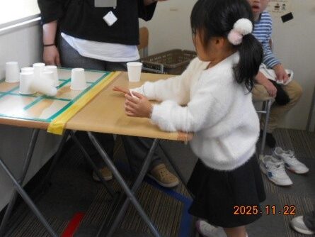 ビー玉カップインではビー玉を転がして倒れている紙コップを立てられるかチャレンジしました。